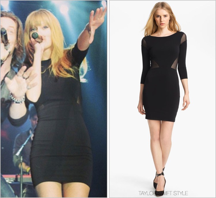 Taylor wore yet another bodycon black dress with sheer mesh inserts by Elizabeth & James. She wore a similar one while she was in London a few weeks ago performing on The Graham Norton Show.