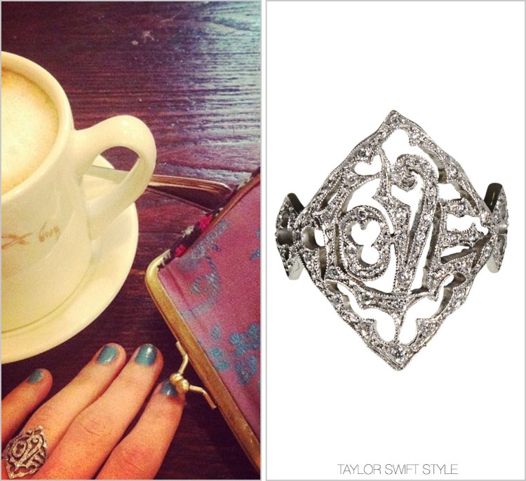 Taylor updated her Twitter yesterday from a café in Nashville. Unfortunately we didn’t get to see the rest of her outfit, but I did catch her ring which she must have dropped more money than her coin purse could hold in order to wear!