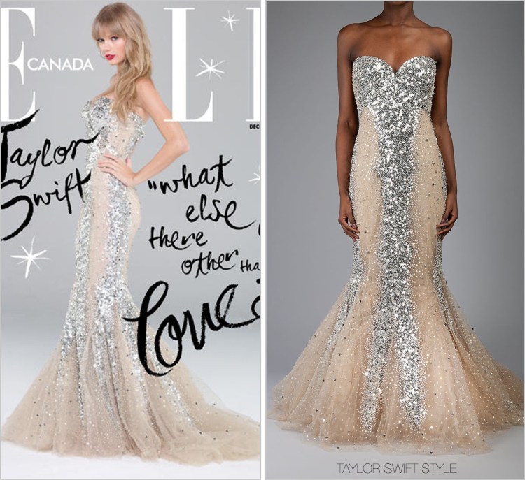 Wow wow wow. Taylor looked stunning and statuesque on the cover of Elle magazine in this body hugging sparkly number by Zuhair Murad.