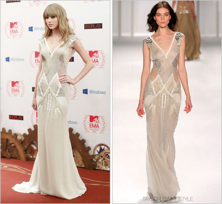 Congrats to Taylor for scooping up three EMA awards tonight. And for doing it while looking sexy and sultry in this sheer, futuristic J. Mendel number.