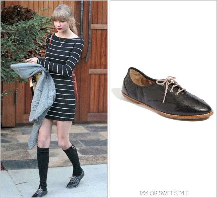 Taylor’s oxfords are no longer available in black, but they are available in a colour she’s worn previously in Los Angeles, on sale through Nordstrom for $106.