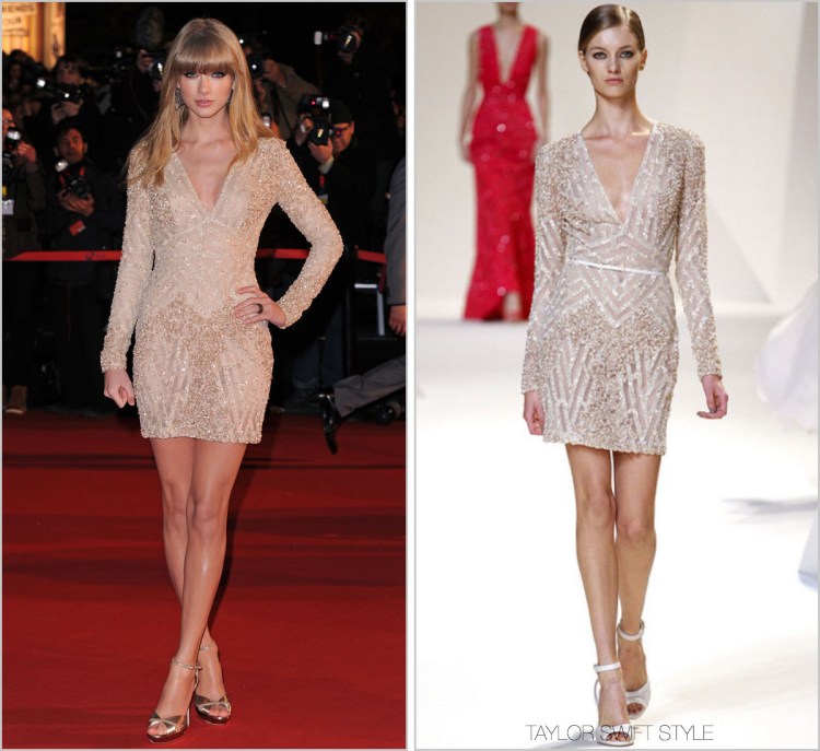 Taylor pulls short, sexy and plunging neckline once again. This time at the NRJ Music Awards in Cannes. I think she looks great here, but it’s a little too reminiscent of her American Music Awards dress by Zuhair Murad.