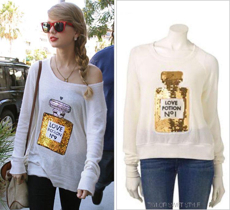 Taylor’s famous Wildfox sweater has been our number one requested Get The Look. Luckily for you, we now have two options for you guys! Check out the other GTL for the sparkly jumper here.
