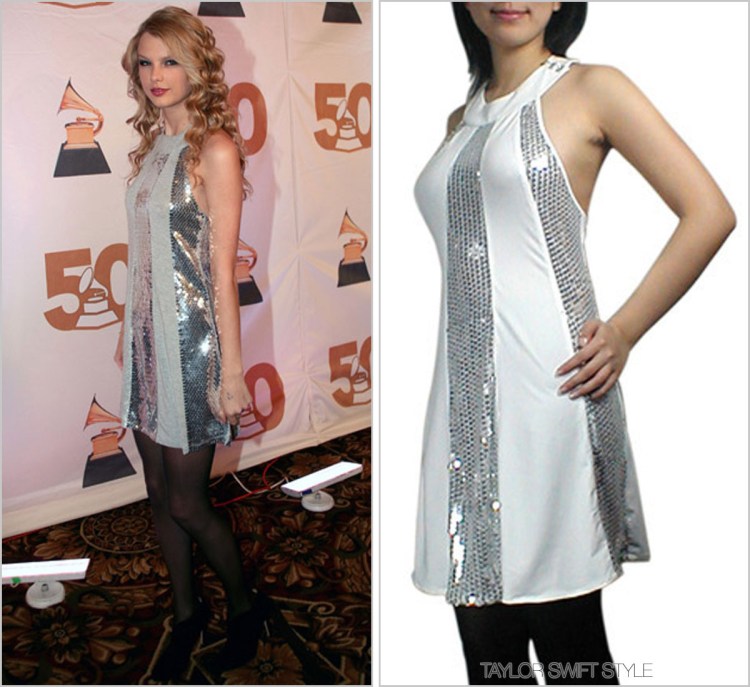 Taylor wore this sequin panel shift dress to the GRAMMY Nominee Party back in 2008 – in addition to wearing it at a few concerts that year as well.