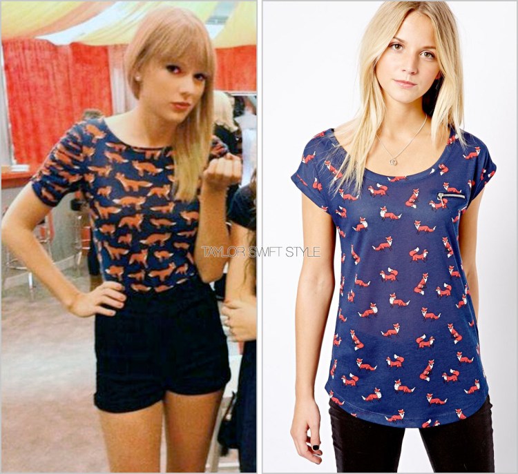 Taylor wore this fox print tee a few times during two Club REDs. Unfortunately sold out by the original retailer Anthropologie, you can get a similar navy tee with adorable foxes via New Look from ASOS.