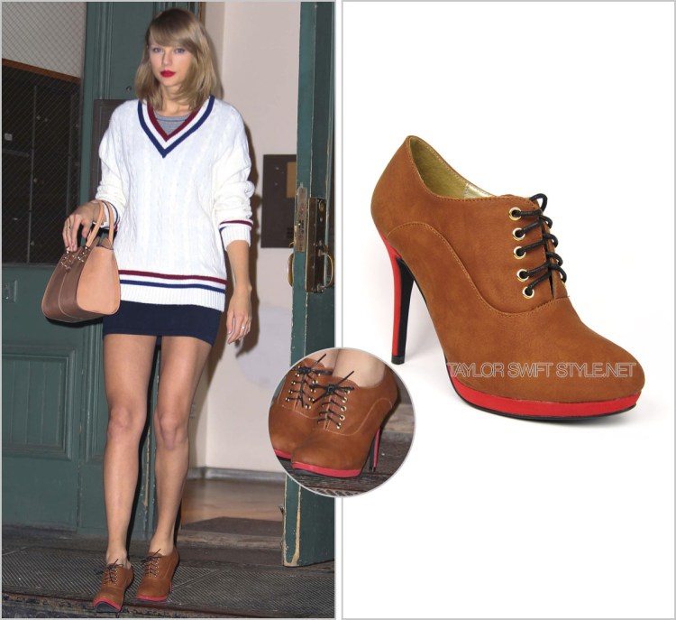 Taylor’s lace-up brown booties featuring a red platform and heel come from the Arden Wohl x Cri de Coeur Fall 2014 collection which unfortunately isn’t available yet. But much love to the CdC team for the photos.