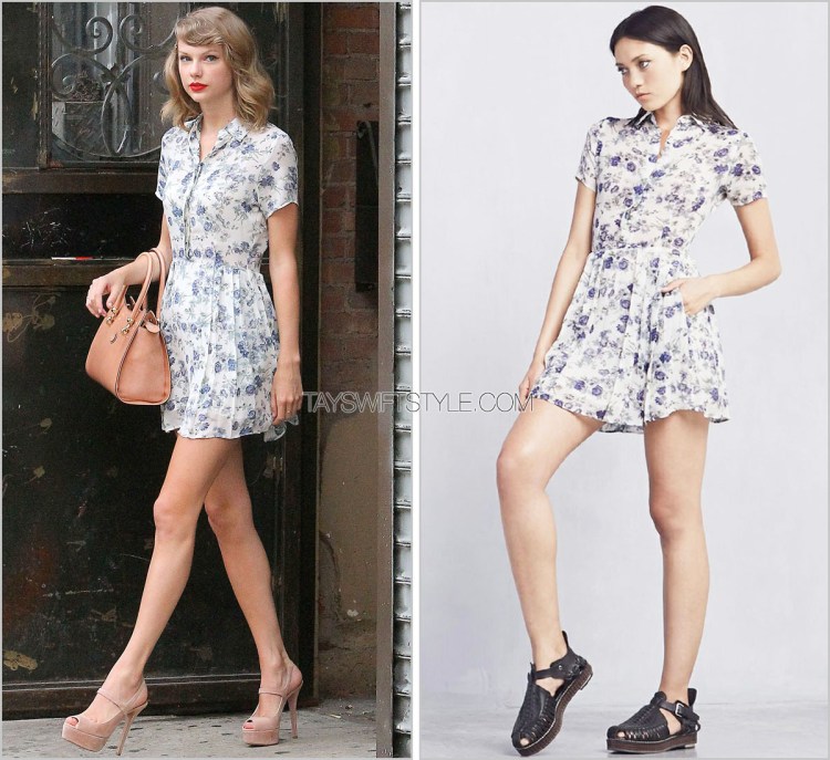 Taylor’s exact delicate floral print dress (her fourth recent outing in pieces from Reformation) is unfortunately sold out in the ‘Elmwood’ style. It is, however, available in the v-cut ‘Athena’ style for the same price.