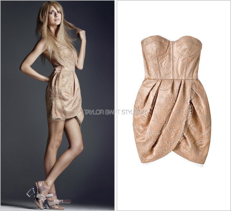 This strapless mini dress – featuring a chantilly lace overlay and tulip skirt – didn’t appear in the runway of Jason Wu’s Spring 2010 collection but it did make it into Taylor’s Spring 2010-infused spread with Elle back in April 2010.