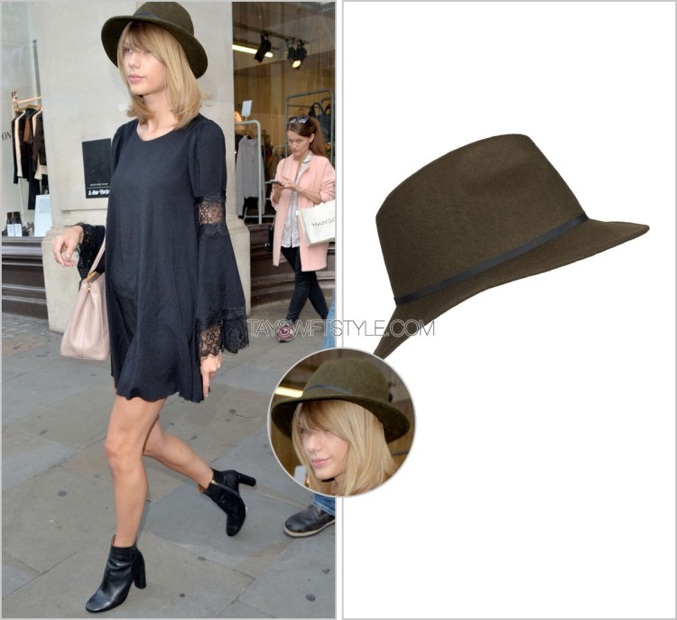 Taylor’s green felt hat was the perfect finishing touch to her boho outfit.