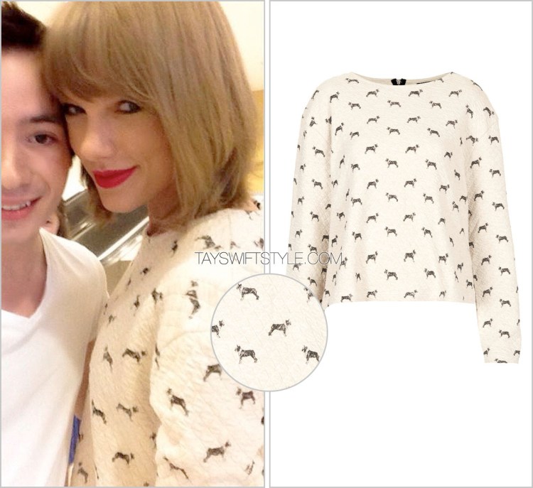 While snapping pics with fans in Australia, Taylor wore this dog-print sweatshirt that features a light quilted texture to it.