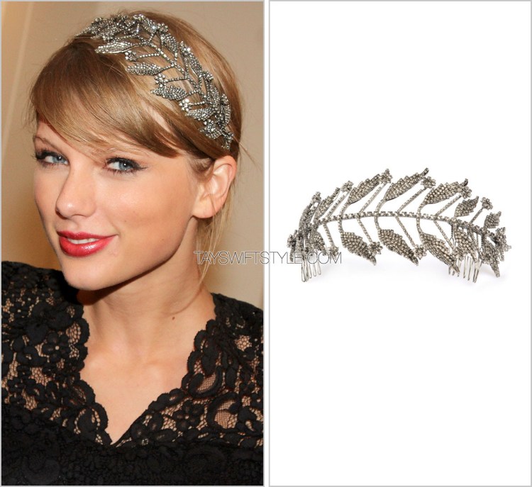Taylor’s must stunning headpiece to date is this beautifully elaborate leaf one by Erickson Beamon.