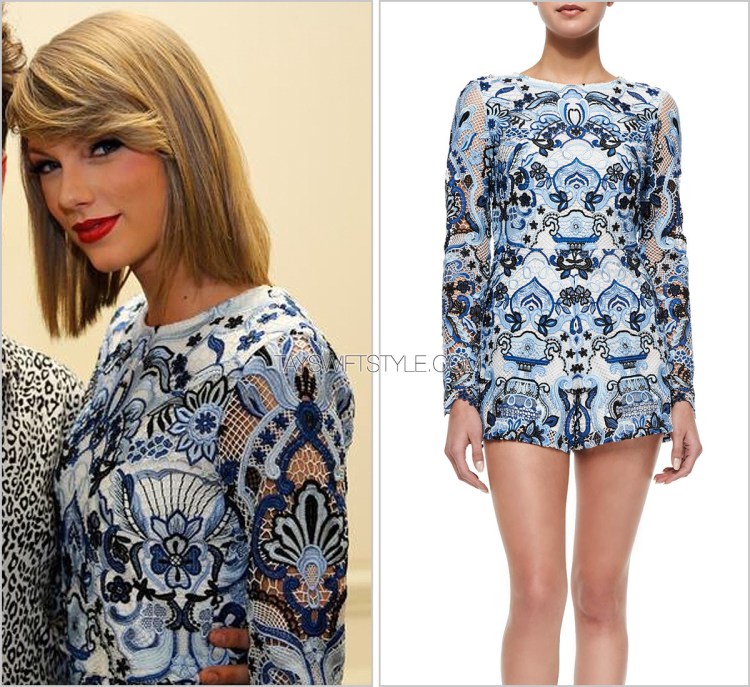 Taylor posed backstage with Nick Grimshaw right before her performance at BBC Radio 1 Big Weekend’s festival. Love how this baby blue patterned romper brings out her colouration.