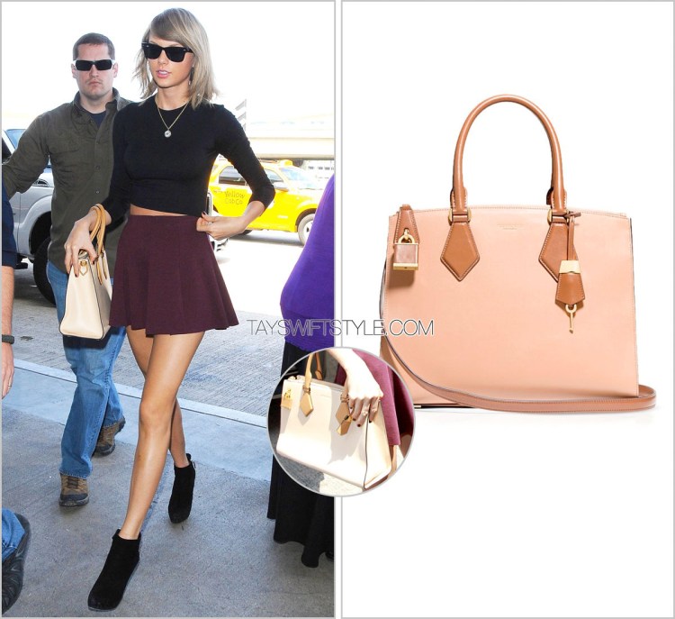 Taylor was photographed at LAX today to depart for Europe carrying her Michael Kors bag. A black one or her Cambridge Satchel may have suited the outfit better but otherwise I love the back-to-basics styling with a long sleeve crop top, skater skirt and heeled booties.