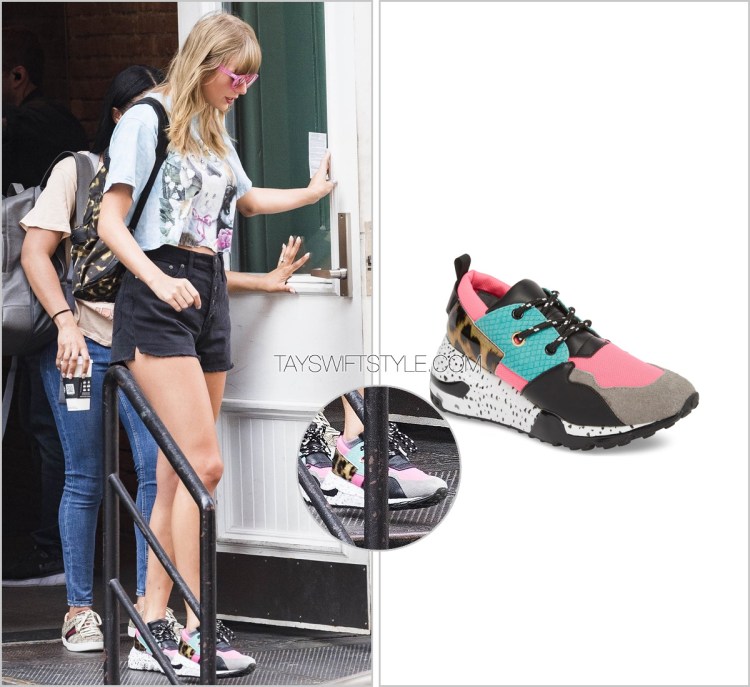 A unique ensemble from head to toe. Taylor looked to complement the pastel colours of her kitten t-shirt with a blue and pink version of her multi-patterned Steve Madden sneakers. You may recognize these interesting shoes from the time she wore them in a different colourway while rehearsing with Robbie Williams in England.