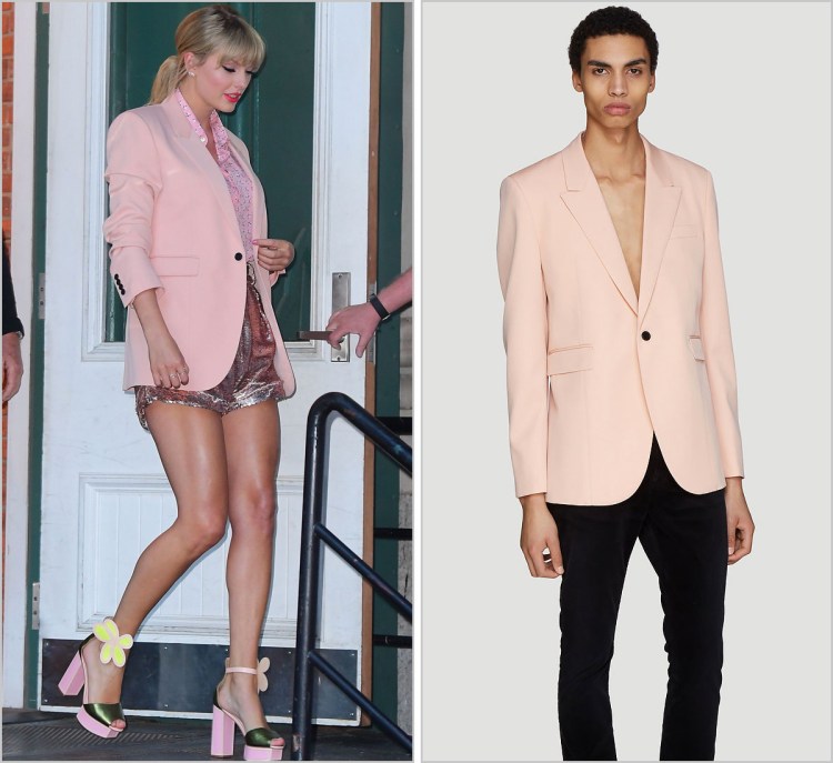 Fun Fact: Taylor’s delightfully pink blazer is from the YSL menswear line.