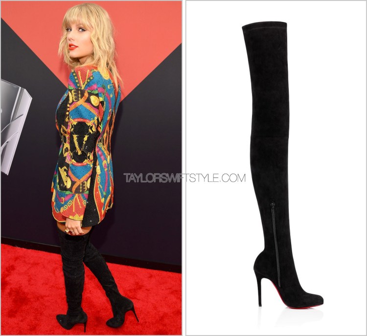 Taylor’s boot style appears to most closely resemble the Eloise toe style, but the Louise XI shaft height. In either instance, embellishment company A-Morir were commissioned to customize the boots with thousands of crystals in various sizes for that ultimate red carpet look.