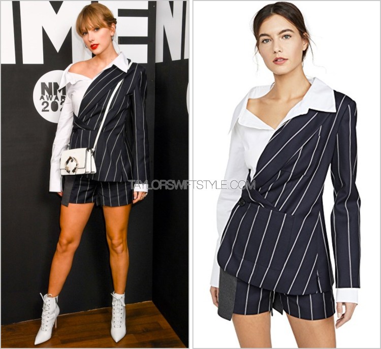 This is an edgier look from Taylor than we’re used to but is entirely appropriate for the NME Awards. While I love the snake detail of the bag, as expounded upon at length in the below linked post, the decision to wear it cross-body here like many fashion influencers and their obsessions with fanny packs is an odd choice for me and does detract a bit from the overall look.