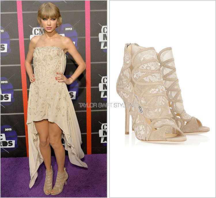 Big points to Taylor for switching it up and opting for these nude suede and lace peep toe booties by her favoured shoe brand instead of a simple pair of pumps or slingbacks like she usually goes for.
