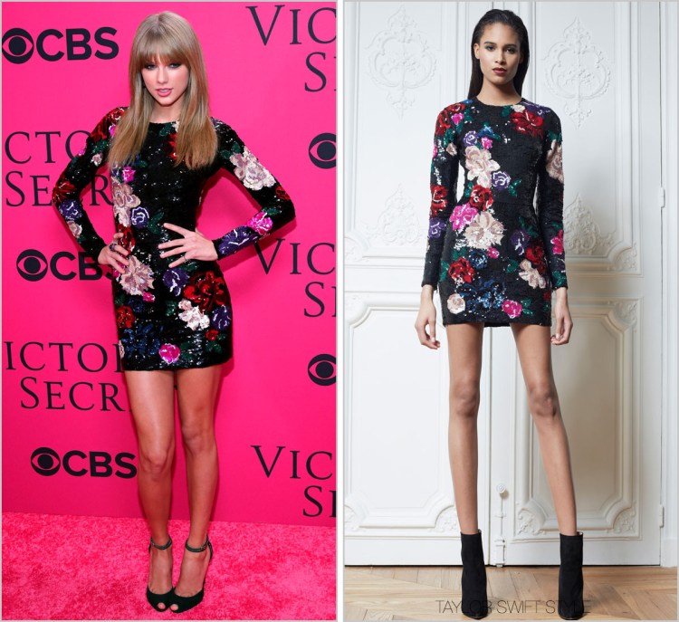 Hell-o! Taylor looked absolutely smoking on the red – or should I say pink – carpet for the VS Fashion Show. Appropriately decked out in the master of sexy dresswear: Zuhair Murad. Taylor selected a long sleeved sequin floral mini from the Fall 2013 collection.