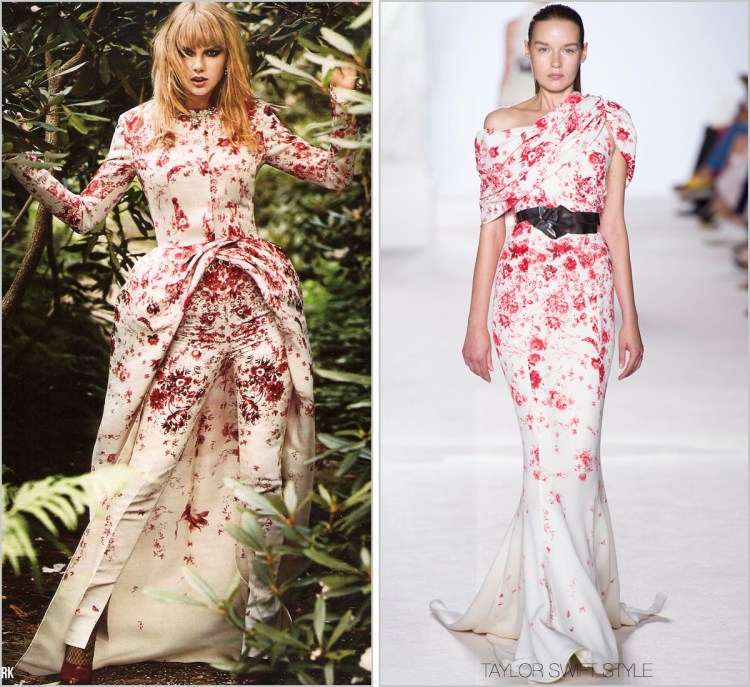 This couture ensemble somehow fell through the cracks when ID-ing the rest of Taylor’s stunning sartorial shoot with InStyle. Featuring the same signature floral designs that was prominent throughout the Fall 2013 Couture collection, Taylor’s look is presented here as a jacket-and-pants combo.