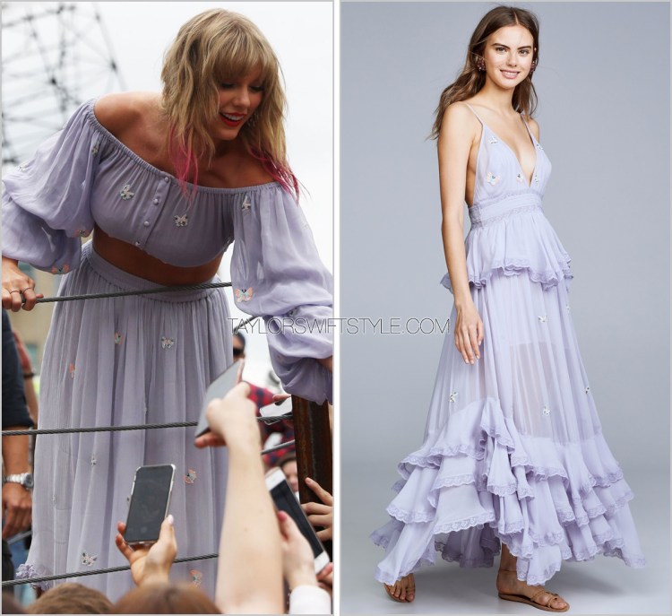 Rococo Sand ‘Embellished Plissé Mini Skirt’ – $220.00 (off white)Taylor stunned a crowd in Nashville wearing a beautiful and floaty off-the-shoulder set by Rococo Sand. Pictured is the same print in a dress. A version of the set can be seen here.