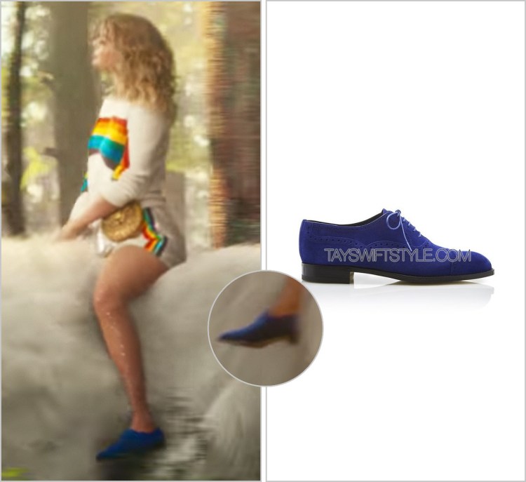 According to Taylor’s stylist, the fun pair of blue shoes she is wearing (that you’d miss in the blink of an eye) are by Manolo Blahnik.