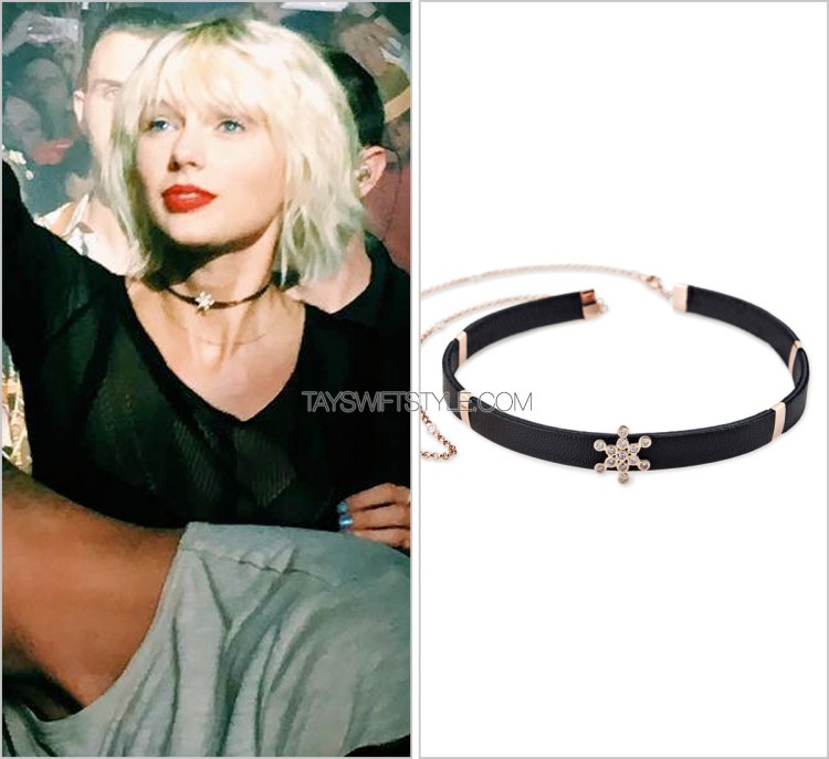 The choker and black continued on Day 3 of the festival, where Taylor attended her boyfriend Calvin Harris’ headlining show. Her choker of the night was this four-digit starry piece by Jacque Aiche.