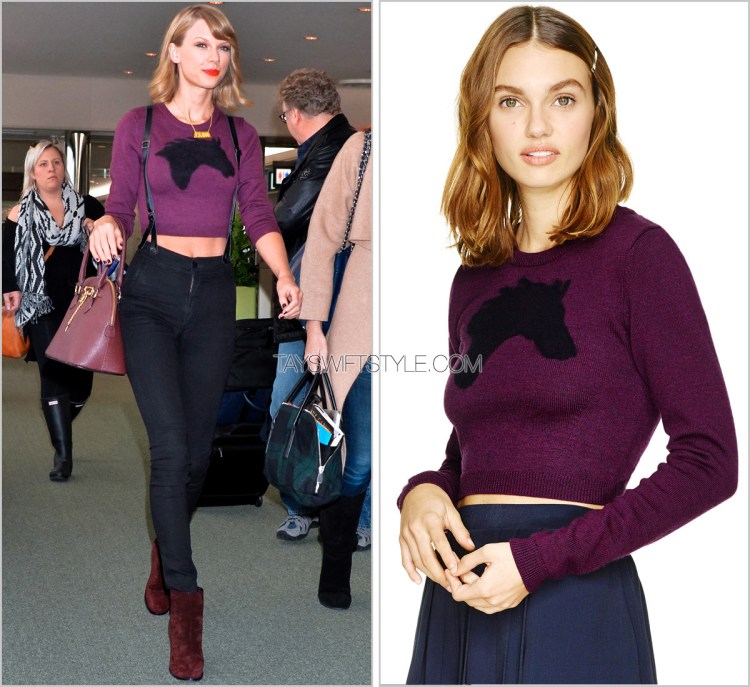 Taylor wore a unique horse crop top sweater in a lovely purple/wine hue. The twee factor of wearing a horse sweater is offset by its cropped silhouette and tight ribbing.