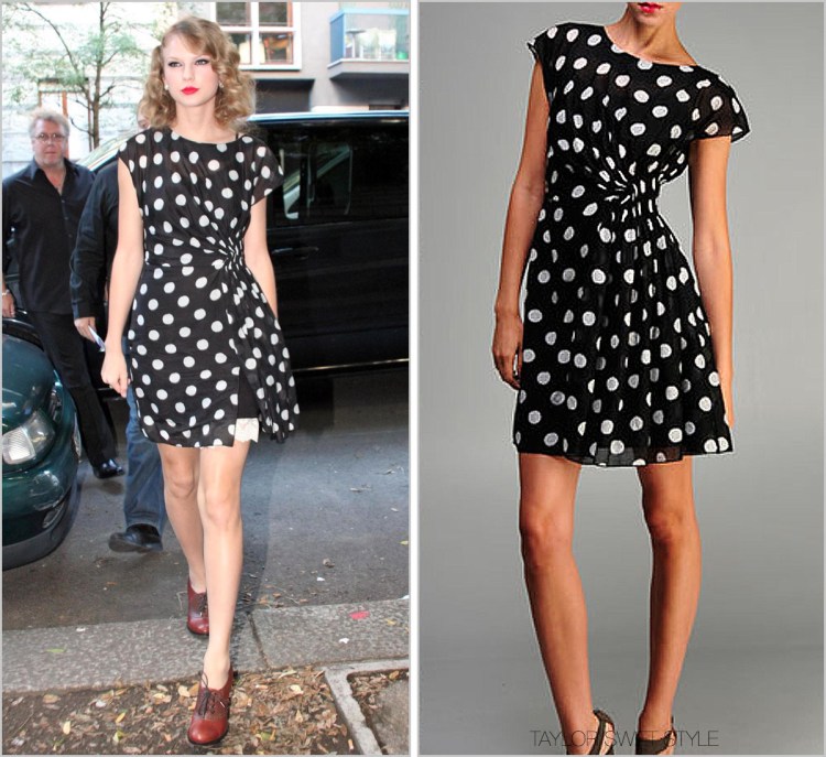 Taylor tucked her hair into a faux bob and swiped on a layer of red lipstick for an old-Hollywood look while doing radio promotions in Italy. Heeled oxfords added a schoolgirl twist.
