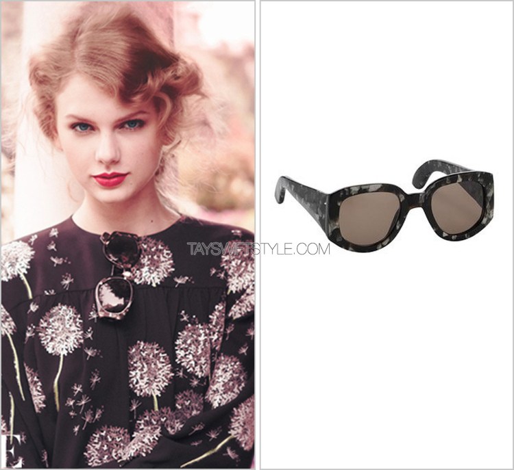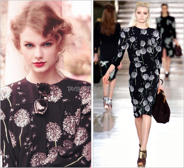 Looking extremely darling in a dandelion print dress from Miu Miu’s Fall 2011 collection, I love Taylor’s lips here. The makeup artist on set used all CoverGirl lipsticks on Taylor including shades of ‘Hot’, ‘Flame’ and ‘Burn’.