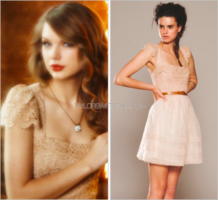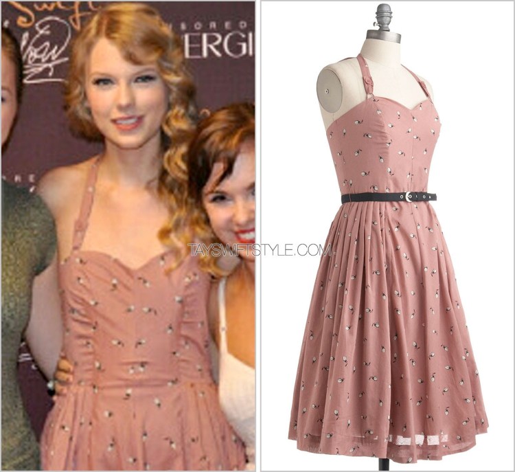 I love this sweet dusty rose colour on Taylor and her soft petal pink lip too. This dress comes form a time when she almost exclusively wore retro designs by Modcloth – this one happens to be retailed from British brand Miss Patina who Taylor went on to wear quite a lot in 2014.