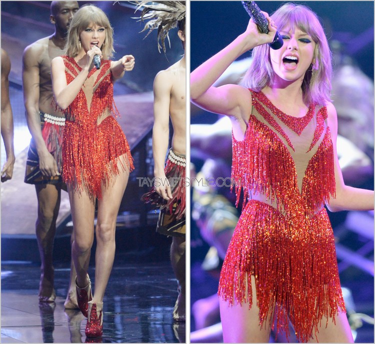 For Taylor’s surprise performance with Nicki Minaj, she wore a red version of L.A. Night 2′s silver bodysuit. It’s a nice change seeing this kind of fiery, bold colour on Taylor since she’s been in a revolving door of sparkly silver numbers as of late.