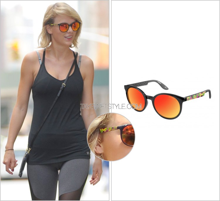 Here’s an exclusive for you guys! Taylor continues to expand on her sunnies collection, veering continually away from her mainstay Raybans and expanding into these super slick red lens sunglasses by Carrera.