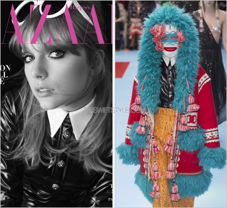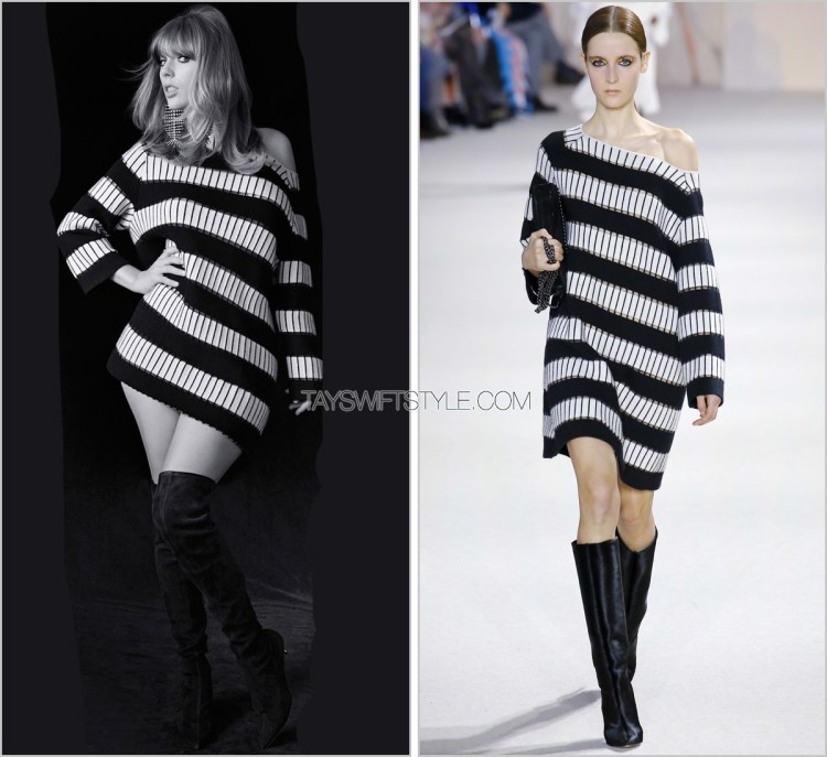 Looking ultra mod with her volumized and bumped up hair + bangs and of course a cute striped mini from Akris. I like the cue from the runway that was taken her in regards to styling, but made even more fun by bumping up the height of the boots to thigh high and making them suede.
