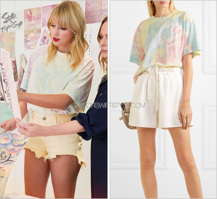 While very similar to the N:Philanthropy tee she previously paired these shorts with, and also this tie dye tee she wore by Alice + Olivia (how many rainbow tees does a single album aesthetic need? All of them) it was of course more appropriate for Taylor to represent Stella while standing next to and collaborating with the designer.