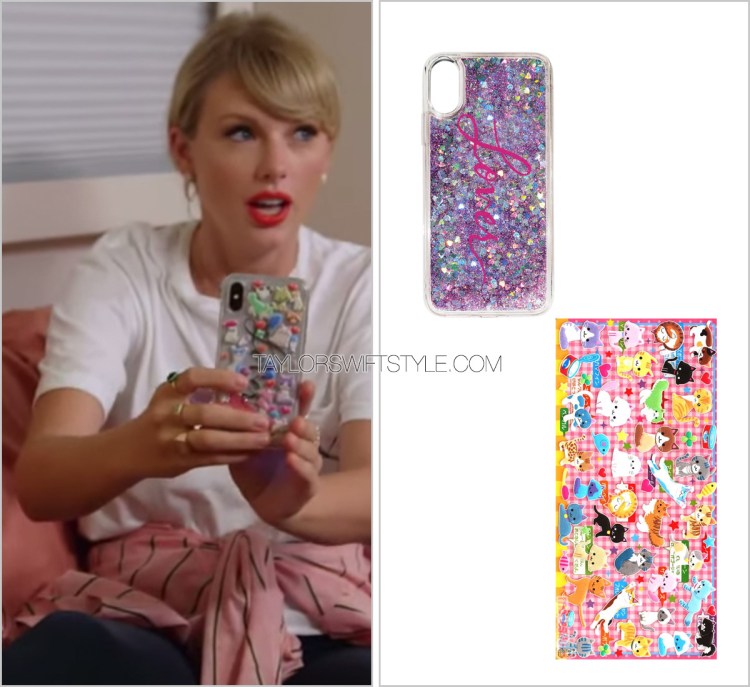 Taylor’s much requested phone case appears to be an unreleased plain clear version of the Lover phone case in her store. The stickers adorning it (cats, naturally) are from a Japanese site and sadly discontinued.