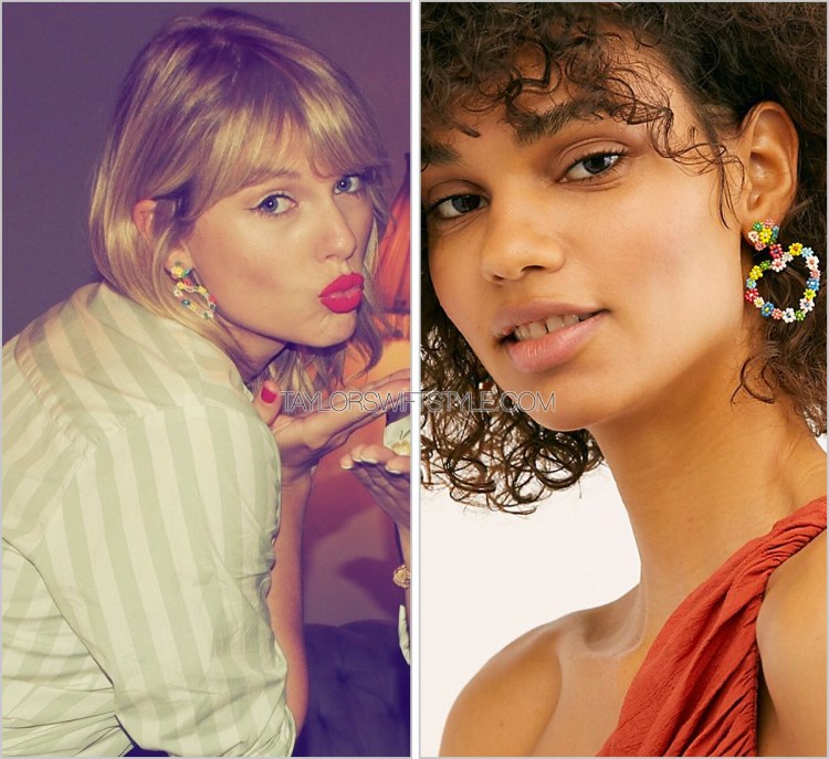 Taylor accessorized with a pair of very colourful floral heart earrings by the brand Mishky – available via one of her favourite retailers Free People.
