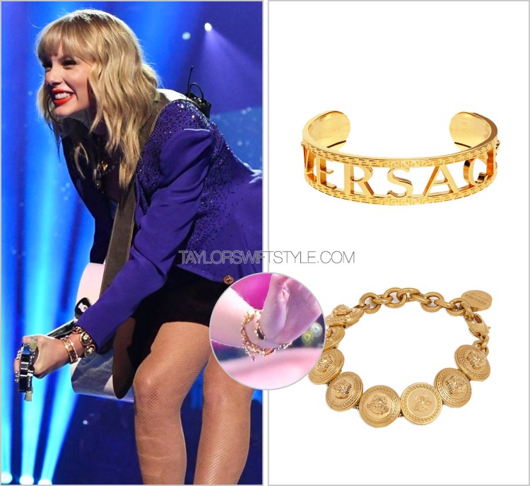 All. Things. Versace. In addition to a custom ensemble by the brand for her red carpet and performance look, Taylor also wore a bevy of jewelry by the brand. Including a trio of layered gold necklaces.