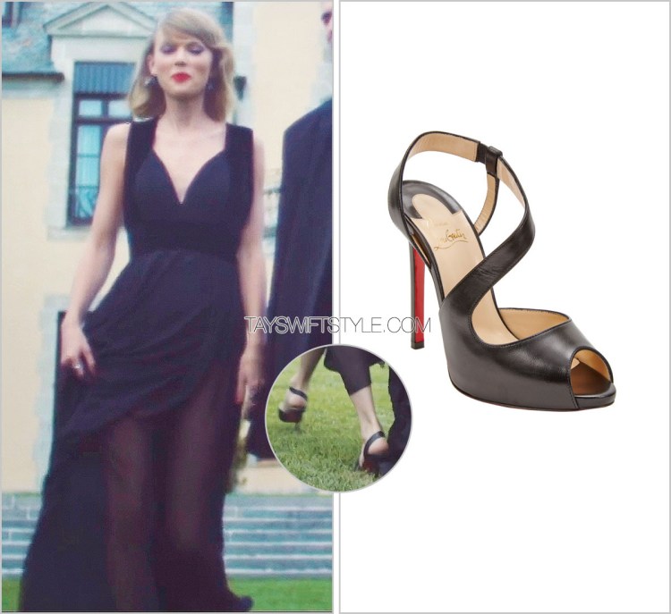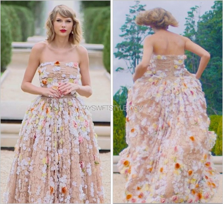 This is the fourth set up that D&G have provided for Taylor’s music video and it’s just as diverse as the last. A simple black gown with interesting straps and a draping bodice perfectly accompany a dramatic smoky eye and rich red lip.