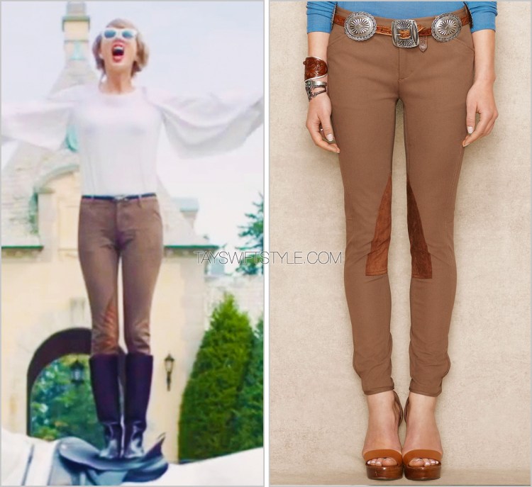 Though Taylor is no stranger to the equestrian vibe courtesy of Ralph Lauren, having worn almost this exact outfit two years ago in Paris, I’m still a bit hesitant in declaring these her exact jodhpurs considering the lack of details from the video.