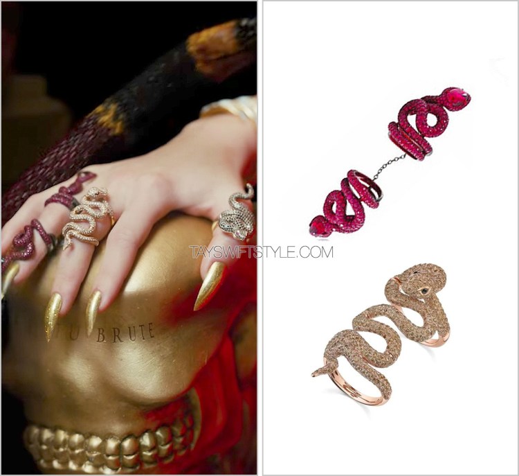 To finish off her look, Taylor’s jewels came courtesy of a variety of designers. Her mismatched ear cuff and black jewelled stud come from Irit Design while her trio of rings were all sourced from different jewellers. The most familiar name here for many of you will be Borgioni as she’s worn them multiple times since the VSFS 2014.