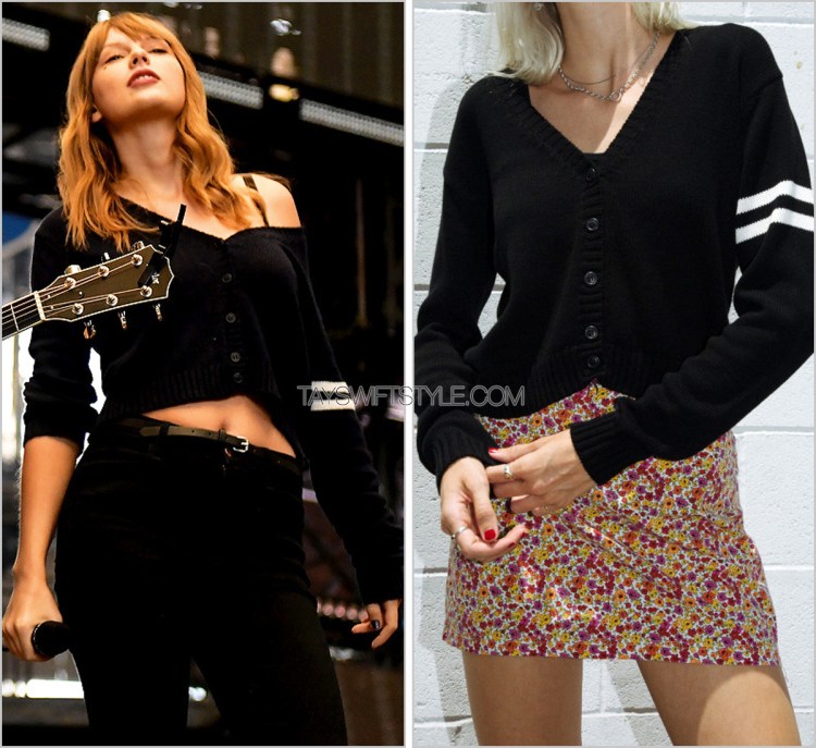 Not only does Taylor look amazing soundchecking with Sugarland to play their song “Babe” but there’s the added bonus of the fact that her uber-affordable love for Brandy Melville has come back into play with this varsity stripe cropped cardigan.