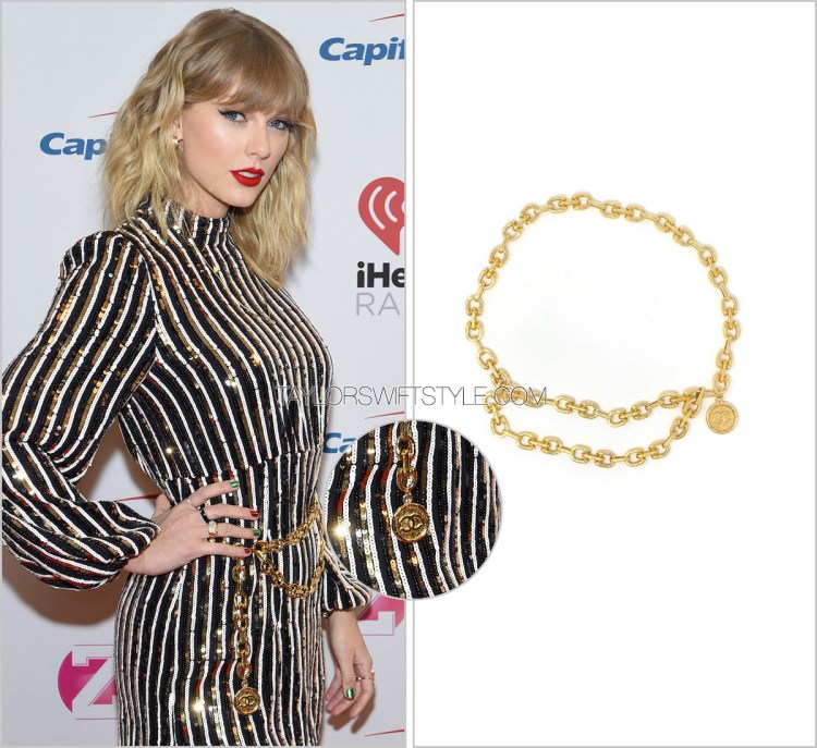 It’s funny as I had just recently talked about Chanel being a painfully underused brand for Taylor — only for her to shortly thereafter hit the red carpet with some intertwined C’s on this chain belt.