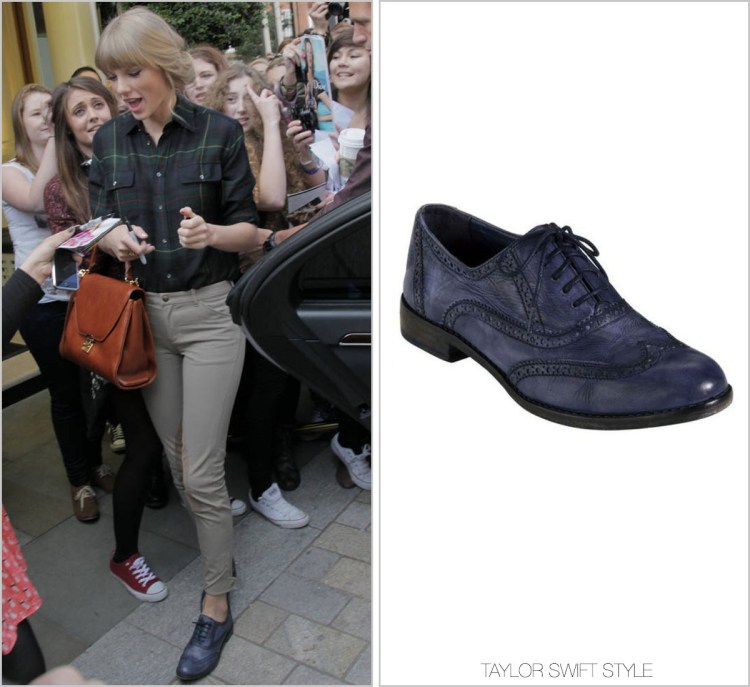 Taylor’s oxfords are no longer available in black, but they are available in a colour she’s worn previously in Los Angeles, on sale through Nordstrom for $106.