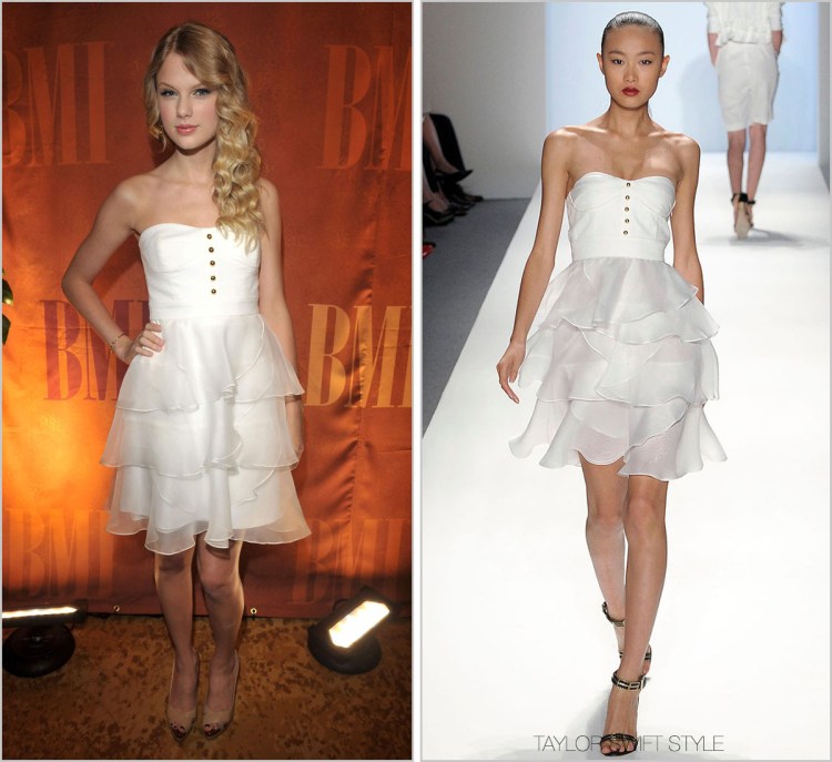 Earlier, Taylor wore a Carolina Herrera coat over this ensemble.