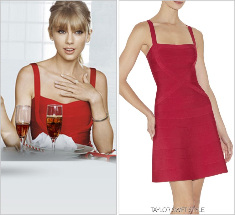 So this is where Taylor got her New Year’s dress from! Photographed for her campaign with Diet Coke, Taylor wore this red Hervé Léger dress at a classy soda dinner table. She later wore this dress while partying with her friends to bring in the new year.