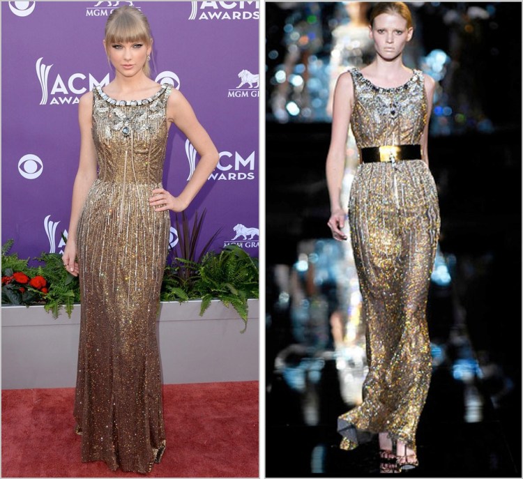 Reaching all the way back to ‘07 in the D&G closet, Taylor showed up to the ACM Awards this Sunday night in a heavily blinged and metallic number which is almost reminiscent of her Kaufmanfranco gown from the 2008 CMA Awards.
