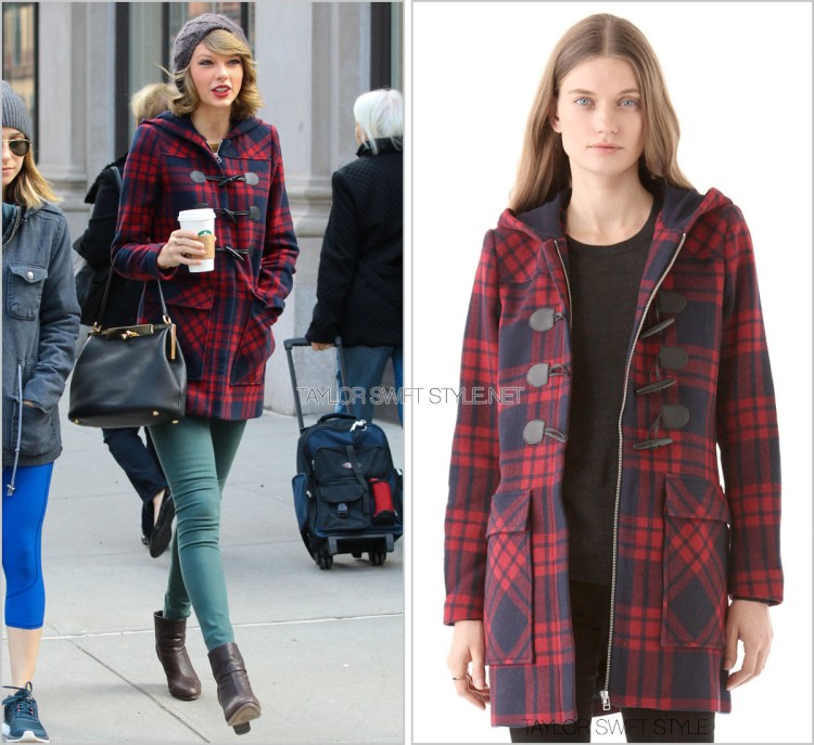 She stepped out for coffee looking warm and mixing colour pallettes wearing a familiar-looking bright red and navy toggle coat by Dolce Vita.