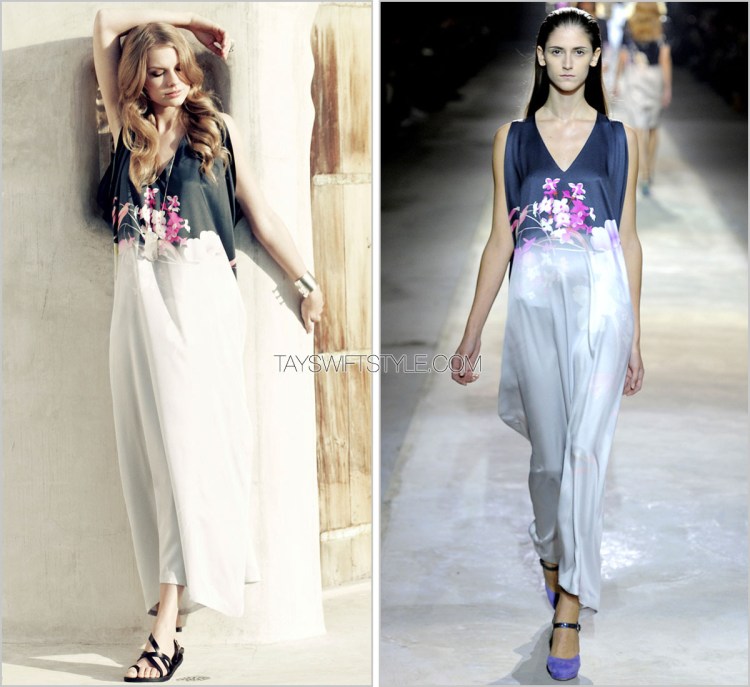 This silken Dries Van Noten dress features a beautiful floral print across the top before fading into a white skirt. Doesn’t she look like a summer goddess?