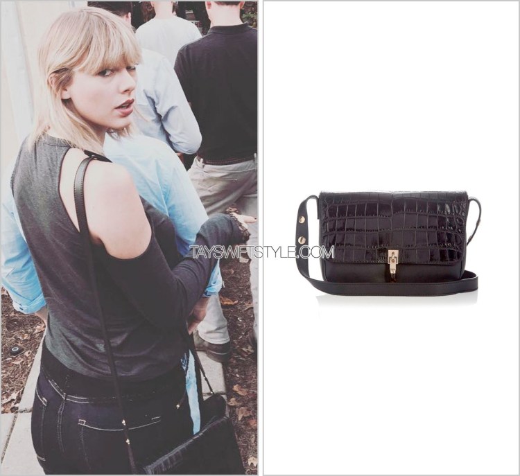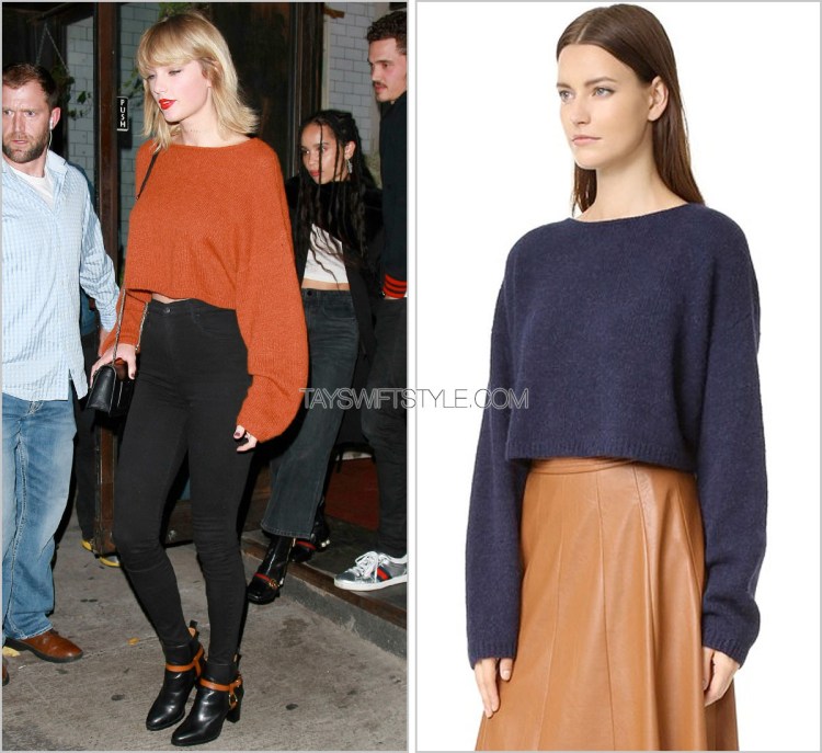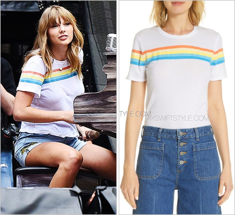 This rainbow top (the latest in Taylor’s love for rainbows this era) would be super cute restyled into a candid in following with the latest resurgence in 70s style. Note the model’s high waisted button up jeans. Add on a stacked pair of brown platform sandals and Taylor’s wavy hair and she’d be set.